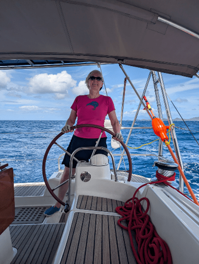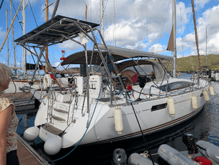 Wir haben für diesen Törn eine Kabine auf einer Jeanneau 53 zum „Mitsegeln“ gebucht. Unsere Skipperin, Karin, kannten wir schon von einem Törn im Mittelmeer. Vervollständigt wurde die Crew von 2 weiteren Männern und einem Ehepaar aus Wien. „Mitsegeln“ bedeutete, dass die Crew das Boot fährt. Nur bei Anker- oder Hafenmanövern ging die Skipperin ans Ruder. Wir fuhren in einer Flotte von 2 Booten.