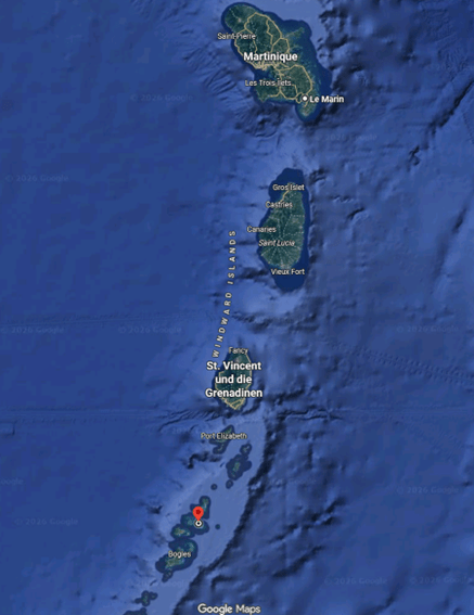 Vom 07.03.-20.03.2026 unternahmen wir, Christine & Kurt, unseren ersten außer-europäischen Törn. Eher per Zufall hatten wir zuvor von unserem Commodore gehört, dass er 30 Jahre zuvor im selben Revier unterwegs war. Wie er starteten wir in Le Marin auf Martinique und fuhren über Saint Lucia und Saint Vincent bis zu den Tobago Cays in den Grenadinen. 301 Meilen ergab die Addition des Logbuches, als wir wieder zurück in Le Marin waren. Die Marina in Le Marin hat ca. 900 Plätze und verfügt über eine Vielzahl von Läden rund um das nautische Geschäft. Aber natürlich auch Kneipen und Bars. Treffpunkt der Segler, die Bar L’Annexe.