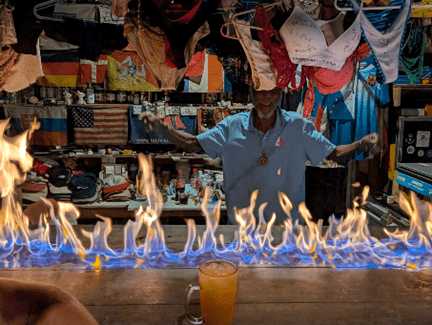 In einigen Buchten gingen wir an Land. Entweder um in einem Resto zu essen oder auch nur in einer Bar einen Punch zu genießen. Die Bars sind all sehr urig. Entsprechen keineswegs europäischen Standards – eher Bretterbuden – aber das Flair und die Drinks sind prima. Es ist wohl müßig, sich über den Rum in der Karibik auszulassen. Am urigsten war es bei Tony’s Bar in der Wallilabou Bay. Den Grund hierfür seht ihr auf einem Bild (Bar in Flammen). An den meisten Tagen wurde aber an Bord gekocht. Natürlich gingen wir in den Buchten schwimmen, respektive schwammen zur Insel. Und es gab wunderbare Sonnenuntergänge.