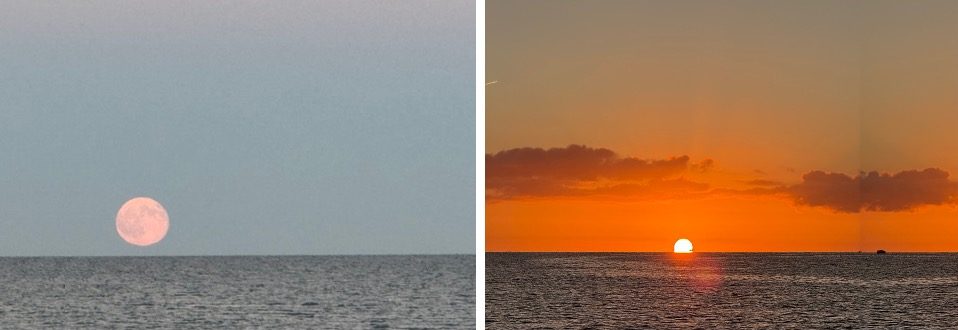 Zu unserer Zeit, im Oktober, waren sogar noch die Ankerbojen aufgelegt. Ein Traumhafter Blutmond und der nächste Sonnenaufgang waren spektakulär. In einigen Buchten trübten nur ein paar Quallen den tollen Eindruck. Nach drei Tagen verließ uns der Tiefenmesser und wir fuhren die Buchten nur noch auf Sicht und mit 2 getrennten Plottern an (blöd). Apropo Plotter: die Backbord Steuersäule war leider ohne Funktion, was den Plotter inkludiert. Sehr ärgerlich! Am Freitag war dann wieder Olbia angesagt und Samstag früh die neue Crew, unsere Jungs aus alten Schultagen, übernehmen. Alles außer der Vorspring los, eindampfen in die Spring bis das Heck rumkommt und viel Fender! Die Kaimauer ist außergewöhnlich, denn genau auf Höhe der Bordwand ragen 6-8 ca. 5cm lange Bolzen aus der Wand. Besser man nimmt noch einen Fender mehr.